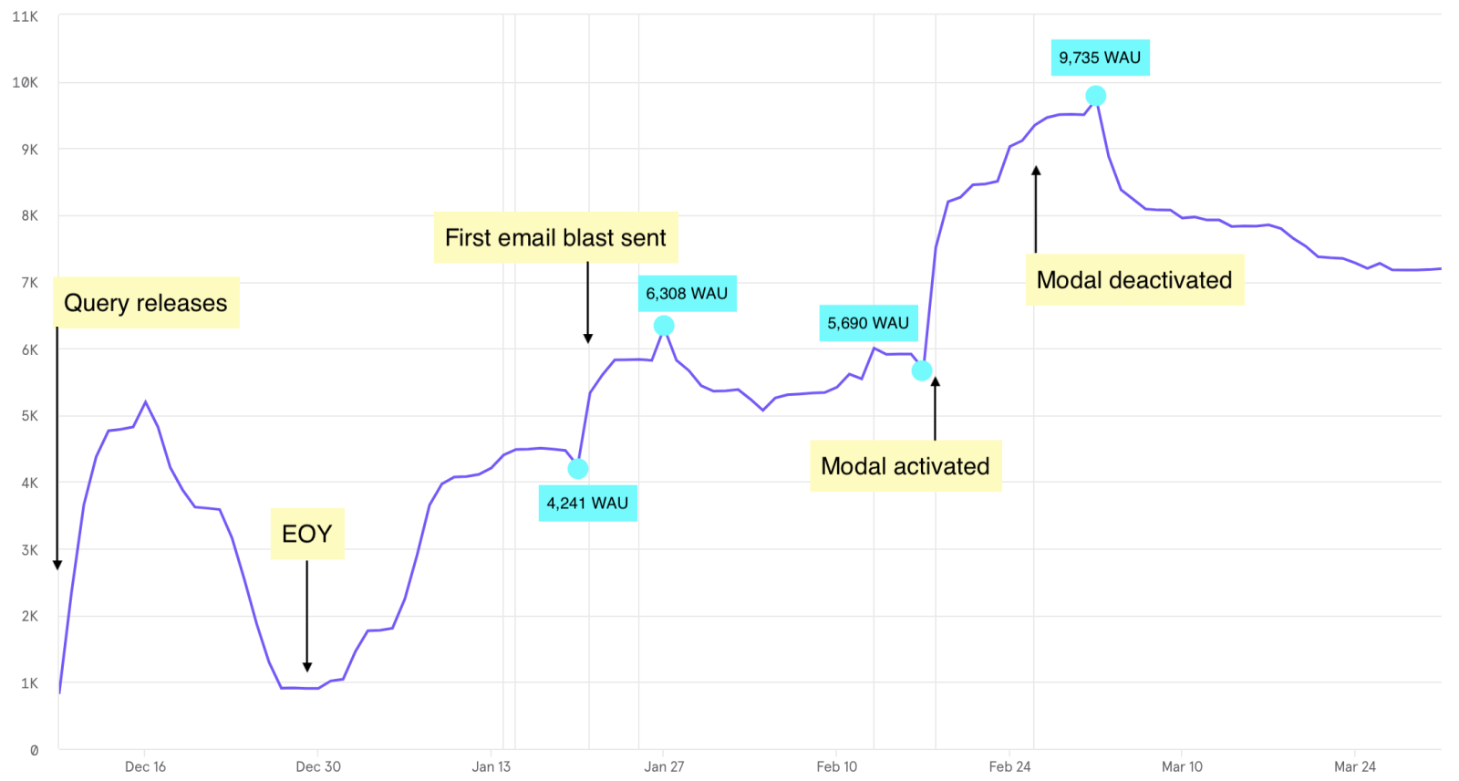 This chart shows a daily view of weekly active users for a major feature we released called query – so it’s a daily count of anyone who’s done anything within query, within the last seven days. I’ve added some labels to show the end-of-year lull, and then the “before” and “after” states of our first out-of-product messaging, followed by a month of no awareness activity (to allow the number of users to stabilize), followed by an in-product awareness pattern. We observed that the email resulted in approximately 2,051 new weekly active users adopting query, and that the in-product awareness modal added another 4,045, meaning in one sense it outperformed the email blast by nearly 100%.